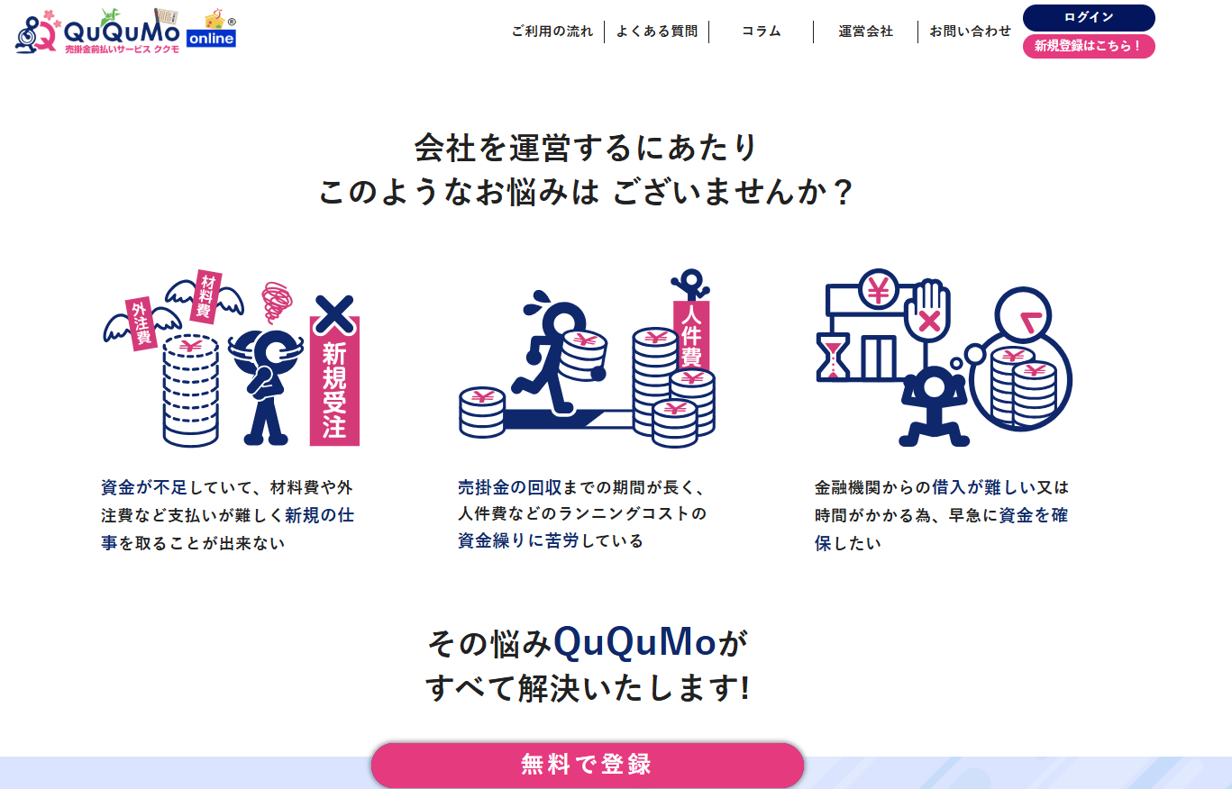 QuQuMo(ククモ)は、ファクタリング業界でトップクラスの利便性を誇る会社です。買取手数料は1.0%〜14.8%と非常に競争力があり、最短2時間で即日入金が可能というスピード感が魅力です。また、買取可能額に制限がないため、小規模事業者から大規模な法人まで幅広く利用できます。個人事業主や中小企業にとっても柔軟なサービスを提供しており、コストと速度のバランスを重視する方に最適です。